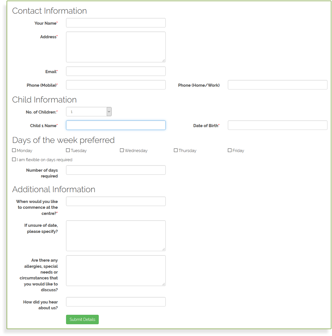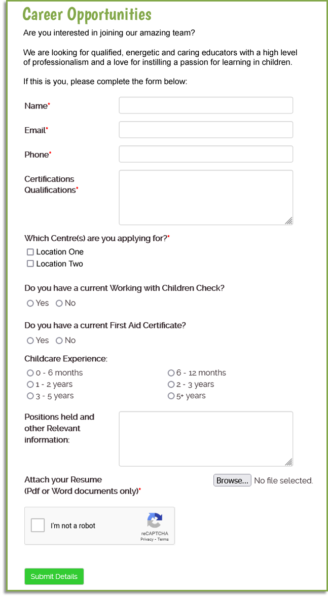 Online Enrolment Application Form, Waiting List Form, Parent Feedback Form, employment enquiry form, Policy Review Forms are all things you may like to include on your website. As the requirements of these forms will differ from client to client - these are generally quoted on an individual basis. Please contact us to discuss your online form requirements.
